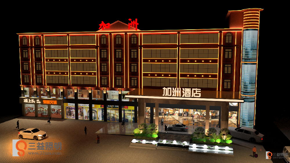 益陽加洲酒店外墻亮化工程設(shè)計(jì),本工程設(shè)計(jì)采用DMX512線條燈、DMX512硅膠燈制作全彩效果。