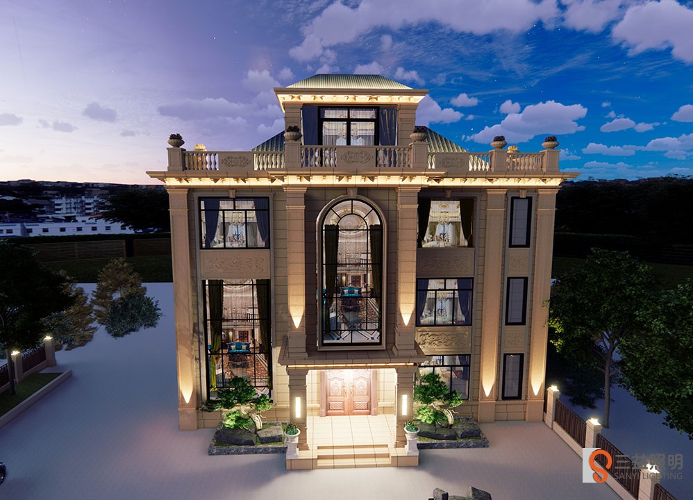 別墅燈光采用3D漫游設(shè)計(jì),燈具采用專業(yè)工程款瓦楞燈、洗墻燈、LED投光燈、高檔柱頭燈、壁燈、草坪燈等,整體燈光營造浪漫、溫馨的環(huán)境。